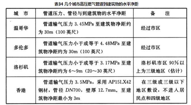 第6.4.15条中高压A燃气管道到建筑物的水平净距30m是参考温哥华、多伦多市的规定确定的。几个城市高压燃气管道到建筑物的净距见表34。
