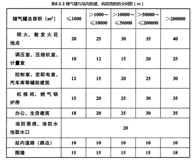 6.5.3为了使本规范的适用性和针对性更强,制定了表6.5.3。此表的规定与《建筑设计防火规范》的规定是基本一致的。表中的储罐容积是指公称容积。