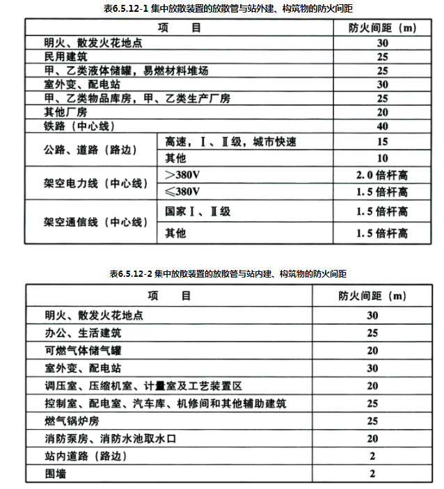 6 当高压储气罐罐区设置检修用集中放散装置时,集中放散装置的放散管与站外建、构筑物的防火间距不应小于表6.5.12-1的规定;集中放散装置的放散管与站内建、构筑物的防火间距不应小于表6.5.12-2的规定;放散管管口高度应高出距其25m内的建构筑物2m以上,且不得小于10m;