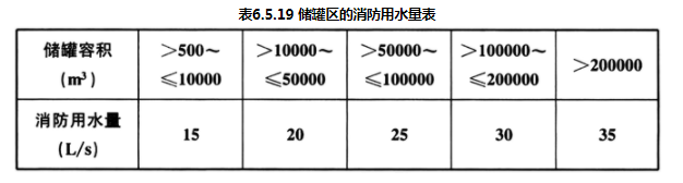 由于储罐的类型和规格较多,消防保护范围也不尽相同,表6.5.19的消防用水量,系指消火栓给水系统的用水量,是基本安全的用水量。