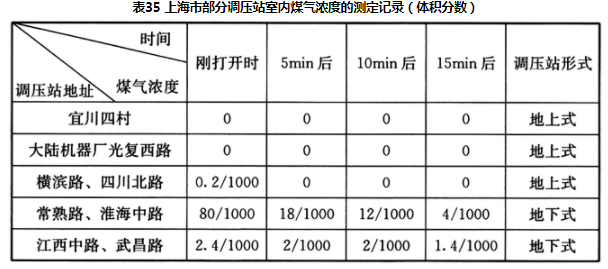 原上海市煤气公司曾用“臭敏检漏仪”对调压站室内煤气(人工煤气)浓度进行测定,在正常情况下(通风换气为每小时2次),地上调压站室内空气中的煤气含量是极少的,详见表35。