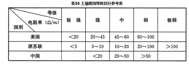 6.7.2 关于土壤的腐蚀性,我国还没有一种统一的方法和标准来划分。目前国内外对土壤的研究和统计指出,土壤电阻率、透气性、湿度、酸度、盐分、氧化还原电位等都是影响土壤腐蚀性的因素,而这些因素又是相互联系和互相影响的,但又很难找出它们之间直接的,定量的相关性。所以,目前许多国家和我国也基本上采用土壤电阻率来对土壤的腐蚀性进行分级,表36列出的分级标准可供参考。