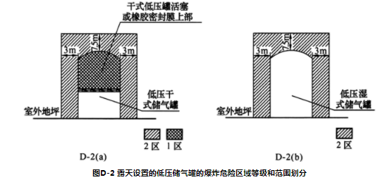 2) 露天设置的低压储气罐的爆炸危险区域等级和范围划分见图D-2(a)和D-2(b)。
