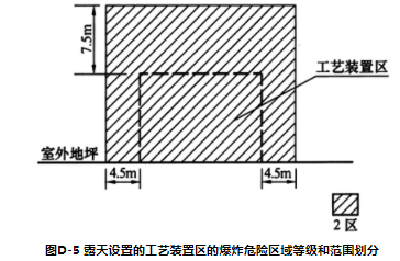 5) 露天设置的工艺装置区的爆炸危险区域等级和范围的划分见图D-5。工艺装置区边缘外4.5m内,放散管管口(或最高的装置)以上7.5m内范围为2区。