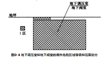6) 地下调压室和地下阀室的爆炸危险区域等级和范围划分见图D-6。地下调压室和地下阀室内部的空间为1区。