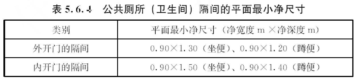 5.6.4 公共厕所(卫生间)隔间的平面净尺寸应根据使用特点合理确定,并不应小于表5.6.1的规定值。