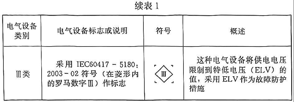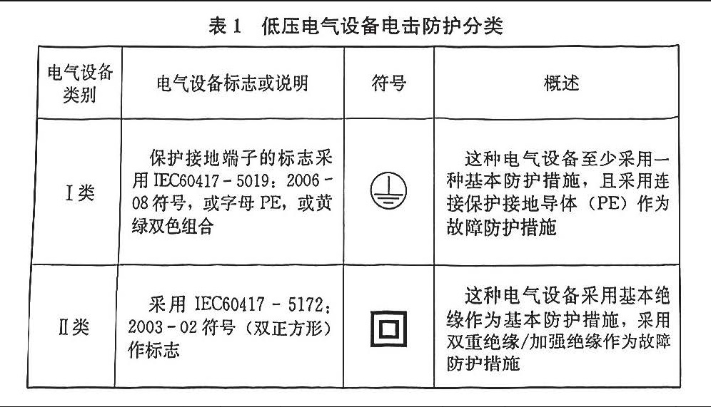 除条文中明确规定外,本规范所提到的低压电气设备是指适用于电击防护分类为I类的电气设备、电气装置、智能化设备和用电设备,这些设备所在的环境为正常环境。低压电气设备的电击防护分类依据《电击防护装置和设备的通用部分》GB/T17045-2020,见表1。