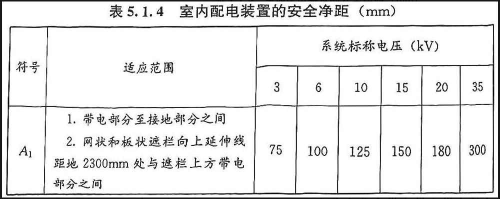 建筑室内配电装置安全净距应满足《3~110kV高压配电装置设计规范》GB50060-2008表5.1.4的规定(由于本规范的适用范围为35kV以下,所以只列出了3kV~35kV的数据)。