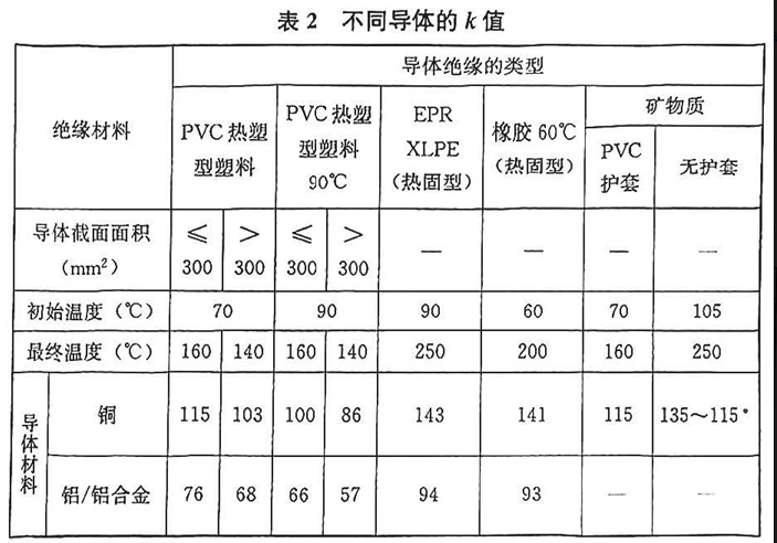 在利用上述公式进行计算时,其k值取决于导体材料的电阻率、温度系数和热容量以及相应的初始和最终温度的系数。常用材料绝缘的导体k值,可按《低压电气装置第4-43部分:安全防护过电流保护》GB16895.5-2012表43A选取,见表2。