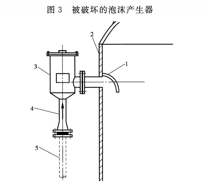 1 目前工程中使用的低倍数泡沫产生器分为横式和立式两种。两者由于安装方式及制造材料的不同,在火灾下会表现出不同的特点。横式泡沫产生器在储罐上水平安装,出口采用法兰连接不小于1m的直管段,进口和管道采用螺纹连接。横式泡沫产生器一般采用铸铁铸造而成,少数采用不锈钢。由于安装特点,在储罐受到爆炸冲击时,横式泡沫产生器会受到力矩作用,再加上其进口连接比较脆弱,采用的材料韧性较差,使得该类型的产生器极易遭到破坏,尤其是目前不少工程中将其安装到了罐壁顶以上,更经不住储罐爆炸的影响。即便是在相对安全的外浮顶储罐,横式产生器也具有被破坏的风险。如2010年3月3日,我国某国家石油储备基地一个10×10m4原油储罐因雷击引起密封圈内的油气爆炸着火,泡沫堰板约80%向储罐中心倾倒(图2),储罐上12个横式泡沫产生器有11个遭到破坏(图3)。立式泡沫产生器为钢制的,有的还采用了奥氏体不锈钢,韧性较好。其泡沫室和产生器本体有一体式的,也有分体式的。由于其在储罐上铅垂安装,和其他管道均采用法兰连接,受力形式明显比横式泡沫产生器合理。因此,考虑到固定顶储罐和内浮顶储罐的火灾模式,规定应选用立式产生器,其在固定顶储罐上的安装方式参见图4。