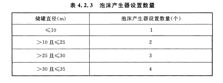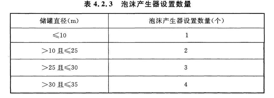 注:对于直径大于35m且小于50m的储罐,其横截面积每增加300㎡应至少增加1个泡沫产生器。
