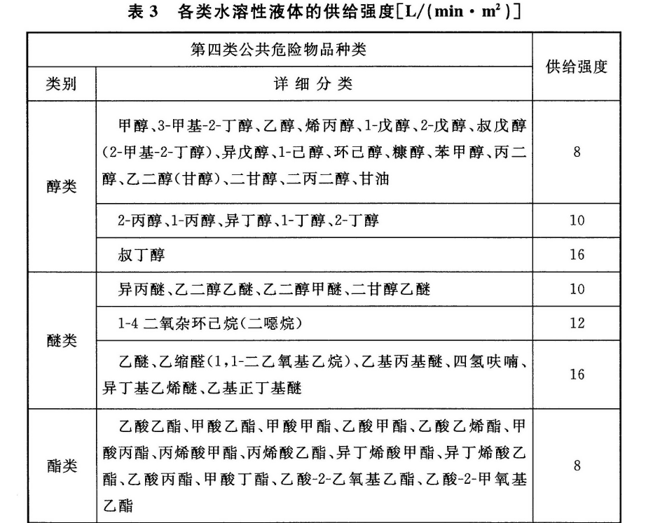 由于缺乏系统研究,《泡沫灭火系统设计规范》GB50151-2010仅规定了10种水溶性液体的设计参数,不便于工程应用,且供给强度均相同,对某些液体可能并不合理。本次修订,为最大限度提供水溶性可燃液体储罐的关键设计参数,天津消防研究所联合相关单位开展了公安部科技强警基础工作专项项目“水溶性可燃液体储罐泡沫灭火机理与技术研究”及中石化科研项目“水溶性可燃液体储罐泡沫灭火关键技术研究”,项目选择了十余种工程中常用立式储罐储存且具有代表性的水溶性可燃液体,开展了冷态试验和灭火试验研究。根据项目的研究成果,将水溶性可燃液体按灭火难易程度及泡沫液种类,进行了分类,分别规定了各类的泡沫混合液供给强度和连续供给时间。为最大限度满足工程设计需要,根据试验研究及相关文献,在每一类中给出了工程中常用的可燃液体。