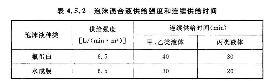 4.5.2 设有围堰的非水溶性液体流淌火灾场所,其保护面积应按围堰包围的地面面积与其中不燃结构占据的面积之差计算,其泡沫混合液供给强度与连续供给时间不应小于表 4.5.2的规定。