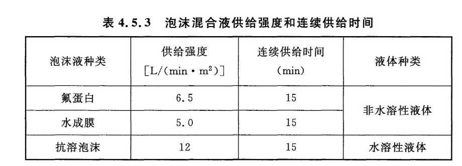 4.5.3 当甲、乙、丙类液体泄漏导致的室外流淌火灾场所设置泡沫枪、泡沫炮系统时,应根据保护场所的具体情况确定最大流淌面积,其泡沫混合液供给强度和连续供给时间不应小于表4.5.3的规定。