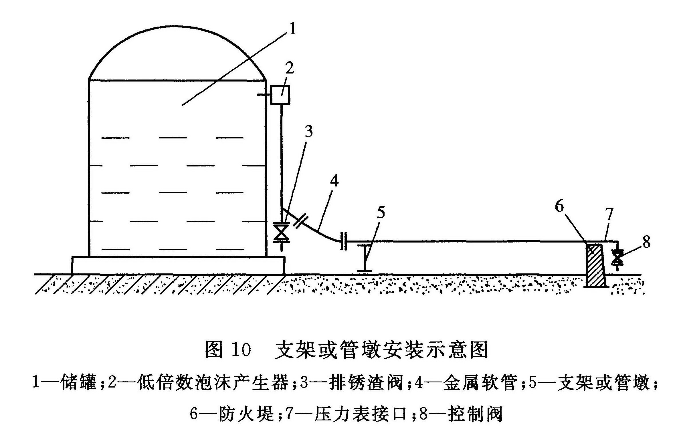 1 本款规定了金属软管在安装时不得损坏其不锈钢编织网,因为编织网用于保护金属软管,一旦损坏,金属软管将有可能也受到损坏,导致渗漏,致使送到泡沫产生装置的泡沫混合液达不到设计压力,影响发泡倍数和泡沫混合液的供给强度,对灭火不利。另外,在软管与地上水平管道的连接处设支架或管墩(见图10),避免软管受拉伸损坏。
