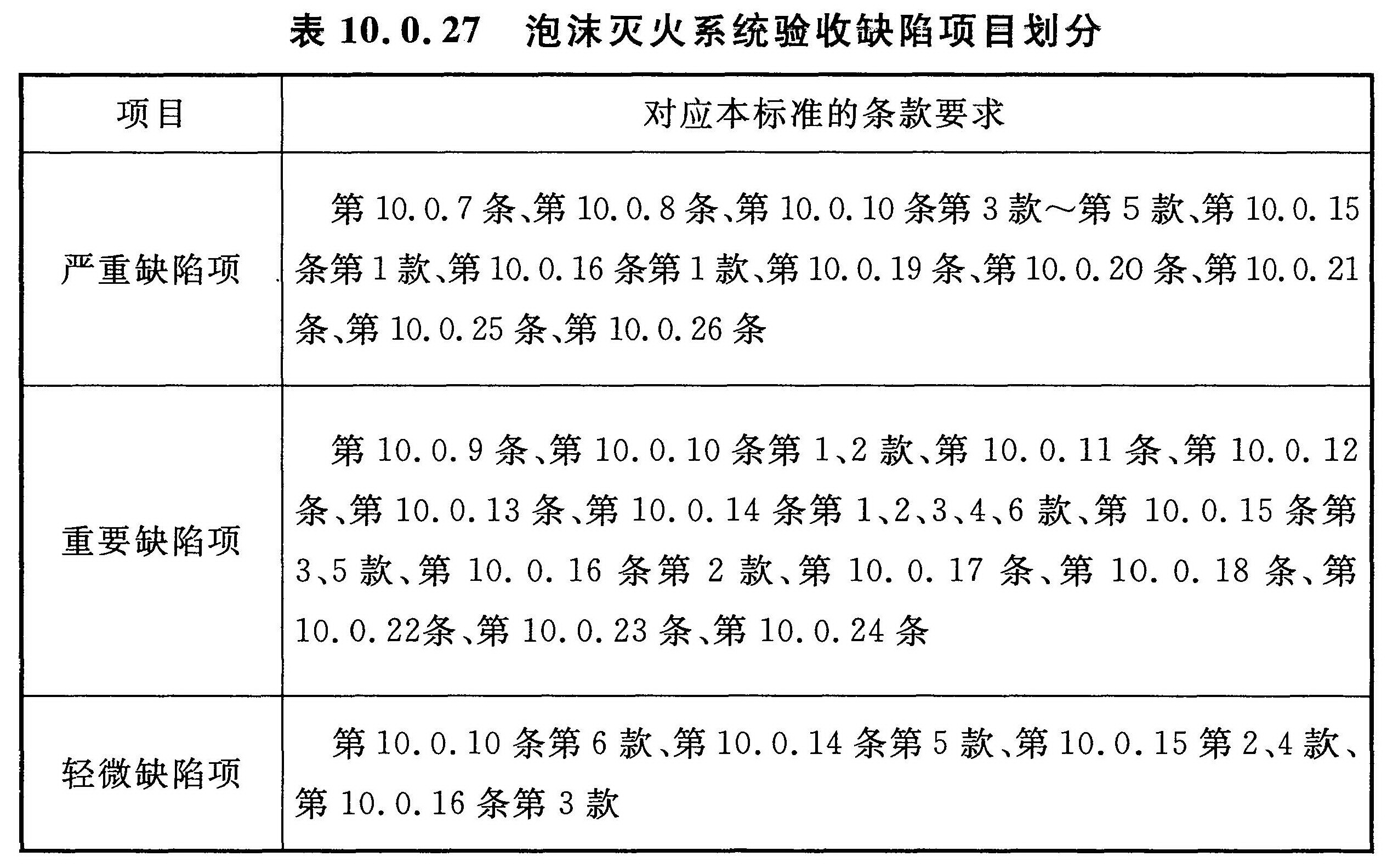 条文说明10.0.1 本条规定了验收时所必须提供的全部技术资料,这些资料是从工程开始到系统调试,施工全过程质量控制等各个重要环节的文字记录。同时也是验收时质量控制资料核查的内容。10.0.2 泡沫灭火系统验收要按本标准附录B表B.0.5进行记录,并作为资料移交存档。10.0.3 泡沫灭火系统验收合格后,施工单位需要用清水把系统冲洗干净并放空,将系统复原,以便投入使用。同时向建设单位移交全部的技术资料,以便建立、健全建设项目档案,并向建设行政主管部门或其他有关部门移交。复原系统的含义包含补充调试、验收使用的泡沫液和消防用水。10.0.5 为了使泡沫灭火系统的验收能够顺利进行,尽管监理单位和施工单位已对系统的组件、材料进行了进场检验,对施工过程进行了全面检查并进行了调试,但验收时还需要按照本条规定的内容对系统的各个组成部分进行验收,以保证系统的施工质量和系统功能验收时能正常运行,并符合设计要求。10.0.6 系统的管道、阀门、支架、吊架的验收在现行国家标准《工业金属管道施工质量验收规范》GB50184、《现场设备、工业管道焊接工程施工质量验收规范》GB50236中有详细规定。10.0.7 供水中断是系统灭火不成功的主要因素之一。利用天然水源作为系统水源时,除水量符合设计要求外,水源需无杂质、无腐蚀性,以防堵塞管道、喷头,腐蚀管道。对于个别地方,用露天水池或河水作临时水源时,为防止杂质进入消防水泵和管网,需在水源进入消防水泵前的吸水口处设有自动除渣功能的固液分离装置,而不能用格栅除渣,因为格栅被杂质堵塞后,易造成水源中断。10.0.8 动力源、备用动力源和电气设备的可靠性关系到系统能否正常运行,符合设计要求是必须的。10.0.9 本条主要检验消防泵房的设置是否满足相关标准的要求。10.0.10 本条的目的是检验泡沫消防泵和稳压泵的实际操作性能。10.0.11 泡沫液储罐规格和型号均应符合设计要求。储罐上的铭牌标记要一目了然,能够反映储罐及泡沫液的基本信息。10.0.12 比例混合装置是泡沫灭火系统的关键部件,比例混合装置种类较多,各类装置都有自己的特点,验收时需要详细检查各装置是否满足设计要求。10.0.13 本条所说的泡沫产生装置不包括喷头,具体喷头的验收见本标准第10.0.16条。10.0.14 报警阀组是泡沫-水喷淋系统的核心组件之一,其各项性能均要满足设计要求。水力警铃一般靠近报警阀设置,并且要能使有关人员容易听到铃声。10.0.15 管网验收要着重注意管网上的各种阀门安装应符合相关要求,另外,管道穿越不同物体的处理也是至关重要的。10.0.16 喷头的验收要保证喷头的规格、型号、空间布置等满足设计要求,并需要根据喷头的实际安装总数核查其备用量。10.0.17 水泵接合器的验收主要检验消防水泵接合器数量及位置是否正确,使用是否方便。10.0.18 泡沫消火栓的验收时需要进行冷喷试验,以检验系统功能,冷喷试验要和系统功能验收同时进行。10.0.19 泡沫消火栓箱的验收需进行喷泡沫试验,试验时要注意选取的泡沫消火栓箱至少要包括隧道两端的两个栓箱。10.0.20 ~10.0.24 这五条规定了泡沫喷雾系统相关组件的验收要求,主要参考了现行国家标准《气体灭火系统施工及验收规范》GB50263的相关规定。10.0.25 本条规定旨在检验系统的整体性能。10.0.26 本条规定了对泡沫灭火系统功能验收试验的项目及要求。泡沫灭火系统功能验收是整个系统验收的核心,按照本条规定的项目进行试验,验证泡沫灭火系统技术性能指标是否达到了设计要求,为以后的正常运行提供可靠的保障。10.0.27 本条规定参照建筑工程质量验收标准、产品标准,把工程中不符合相关标准规定的项目,依据对泡沫灭火系统的主要功能影响程度划分为严重缺陷项、重要缺陷项、轻微缺陷项三类。综合各类缺陷项统计数量,对系统主要功能的影响程度,以及国内泡沫灭火系统施工过程中的实际情况及其他相关规范等,判定工程合格与否。