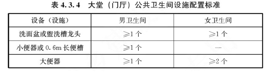 4.3.1 在设置无障碍客房旅馆中,公共设施之间应提供无障碍通行流线。4.3.2 单面布房的公共走道净宽不应小于1.30m,双面布房的公共走道净宽不应小于1.40m。4.3.3 3层及3层以上的旅馆应设乘客电梯。4.3.4 旅馆大堂(门厅)附近应设公共卫生间;大于4个厕位的男女公共卫生间应分设前室;卫生器具的数量应符合表4.3.4的规定,并应设1个内设污水池的清洁间。