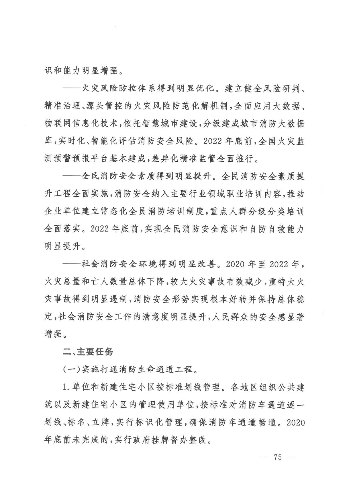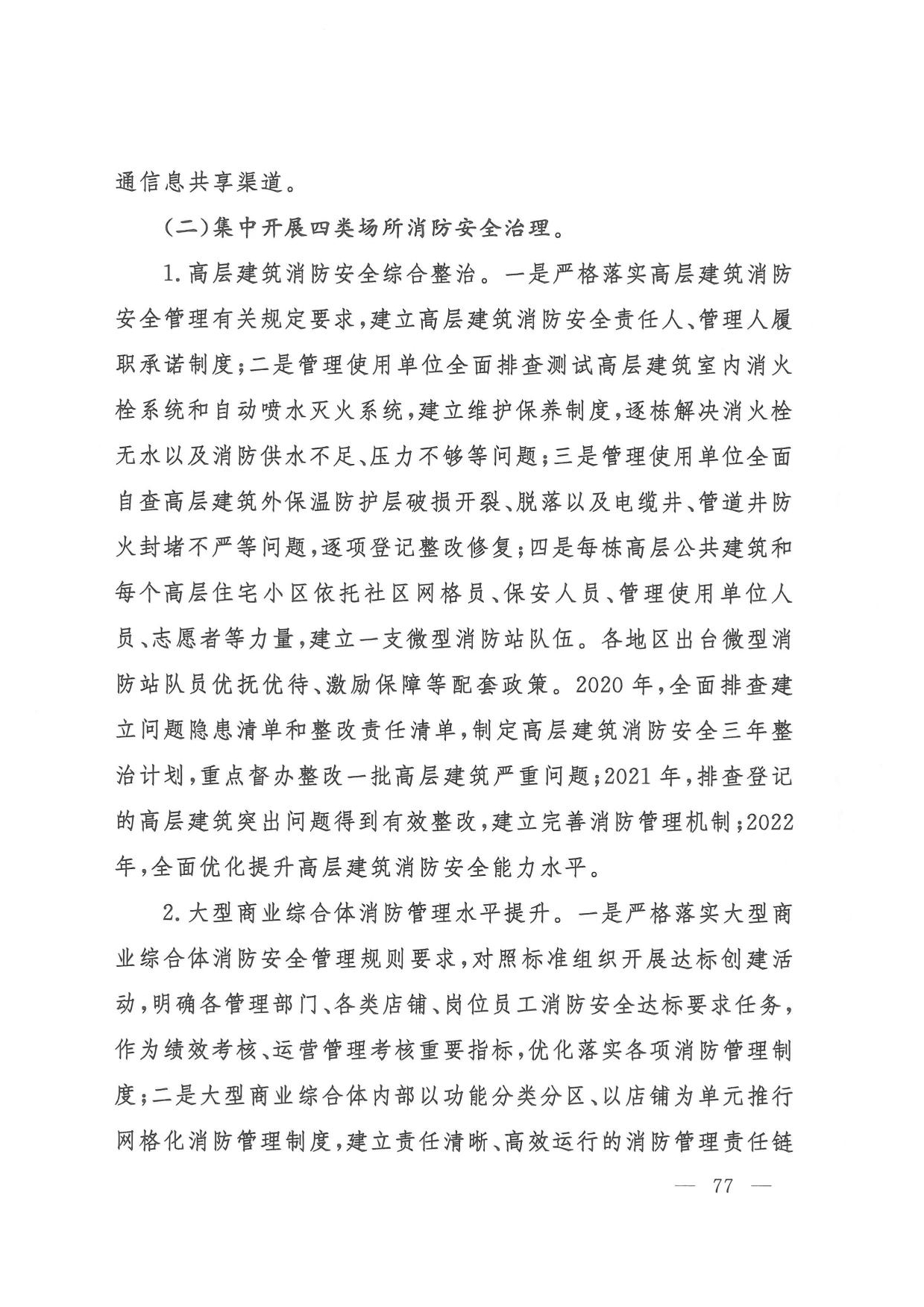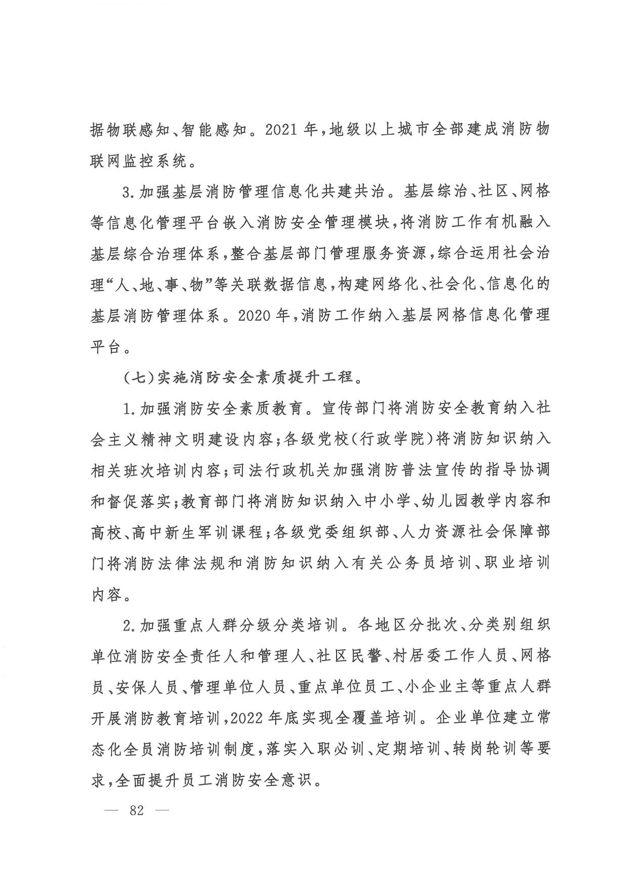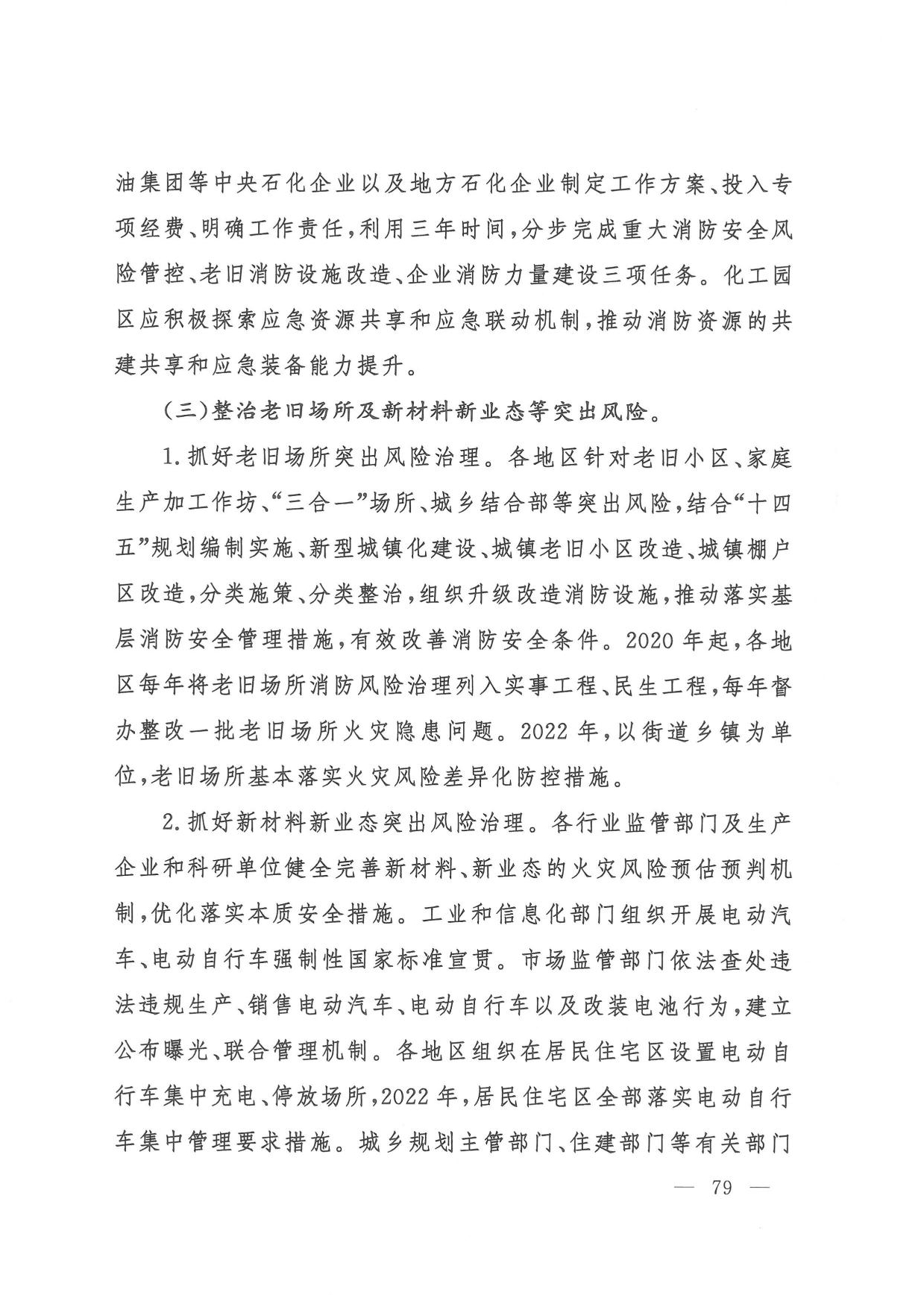 (六)消防安全整治。一是组织开展打通消防“生命通道”工程,指导各地制定实施“一城一策、一区一策”综合治理方案,2022年底前分类分批完成督办整改。二是针对高层建筑、大型商业综合体、地下轨道交通、石油化工等重点场所,制定实施消防安全能力提升方案,2022年底前实现标准化、规范化管理。三是聚焦老旧小区、电动车、外墙保温材料、彩钢板建筑、家庭加工作坊、“三合一”场所、城乡接合部、物流仓储等突出风险以及乡村火灾,分阶段集中开展排查整治,2022年底前全面落实差异化风险管控措施。四是教育、民政、文化和旅游、卫生健康、宗教、文物等重点行业部门建立完善行业消防安全管理规定,明确3年整治目标任务,推动本系统单位提升消防安全管理水平。五是积极推广应用消防安全物联网监测、消防大数据分析研判等信息技术,推动建设基层消防网格信息化管理平台,2021年底前地级以上城市建成消防物联网监控系统,2022年底前分级建成城市消防大数据库。(应急管理部牵头,教育部、公安部、民政部、自然资源部、住房城乡建设部、农业农村部、商务部、文化和旅游部、国家卫生健康委、市场监管总局、国家宗教事务局、国家文物局等按职责分工负责)