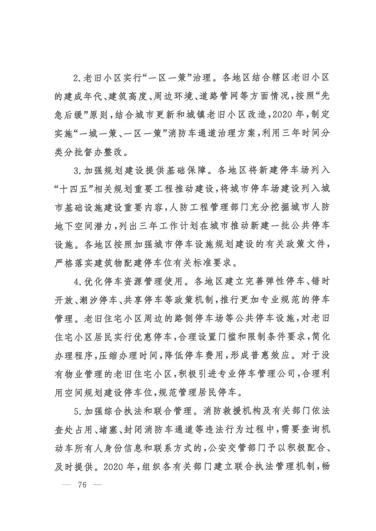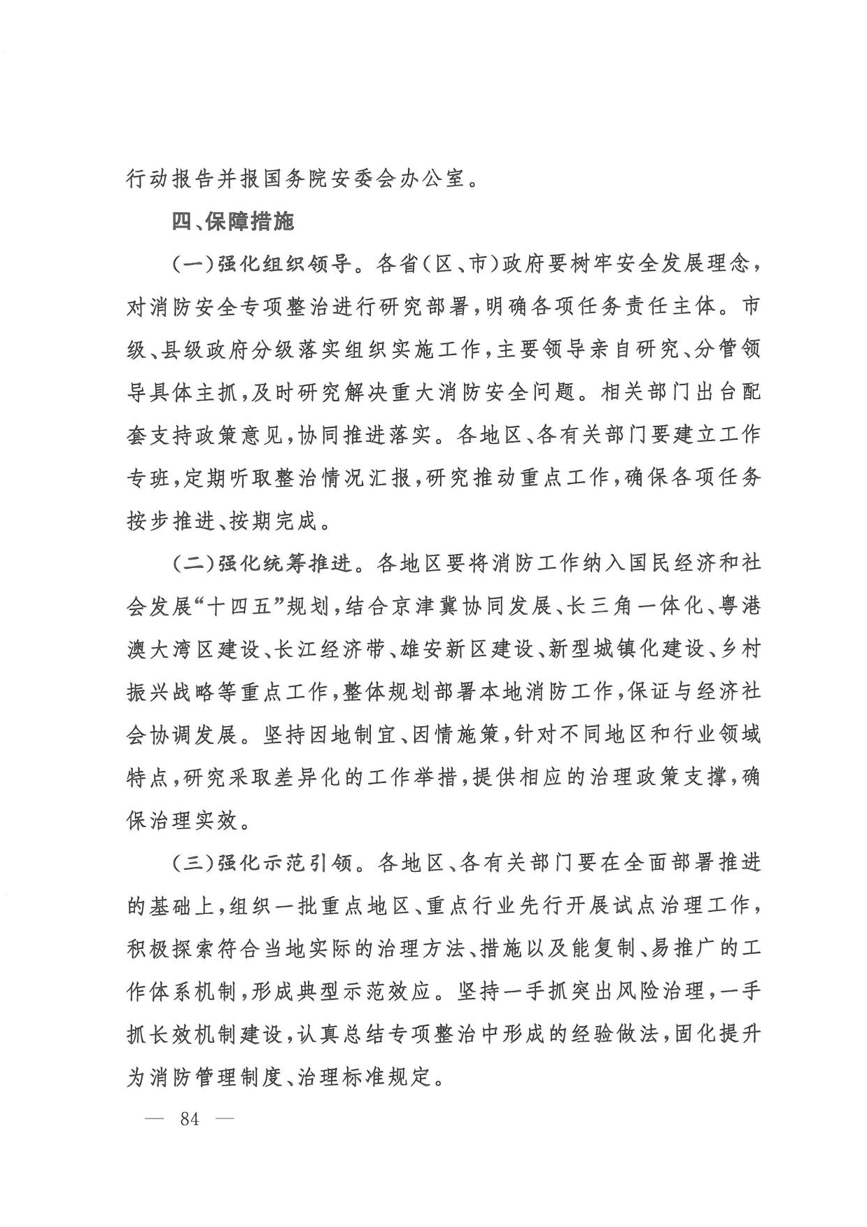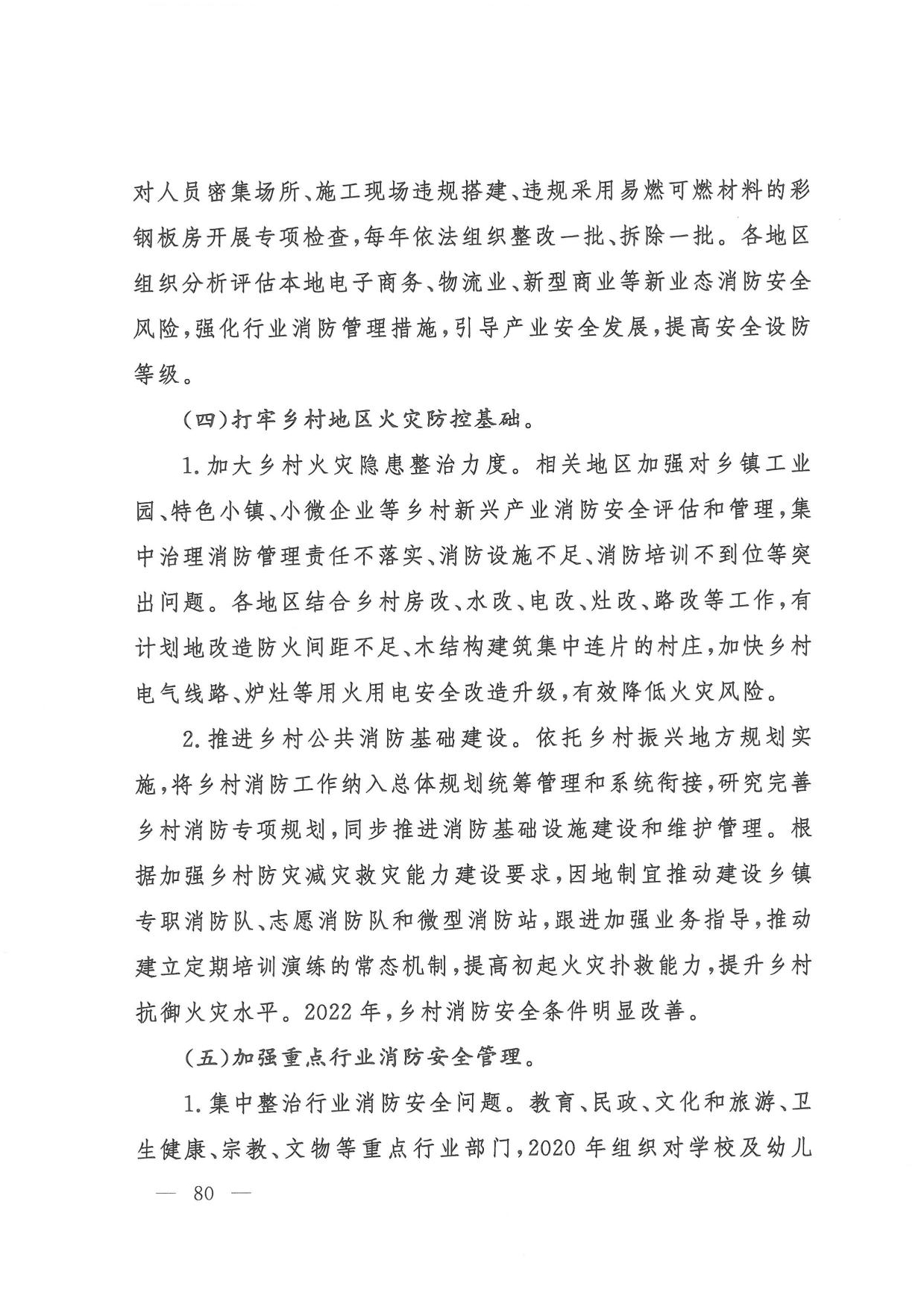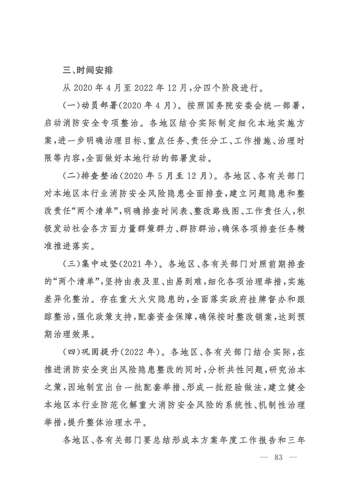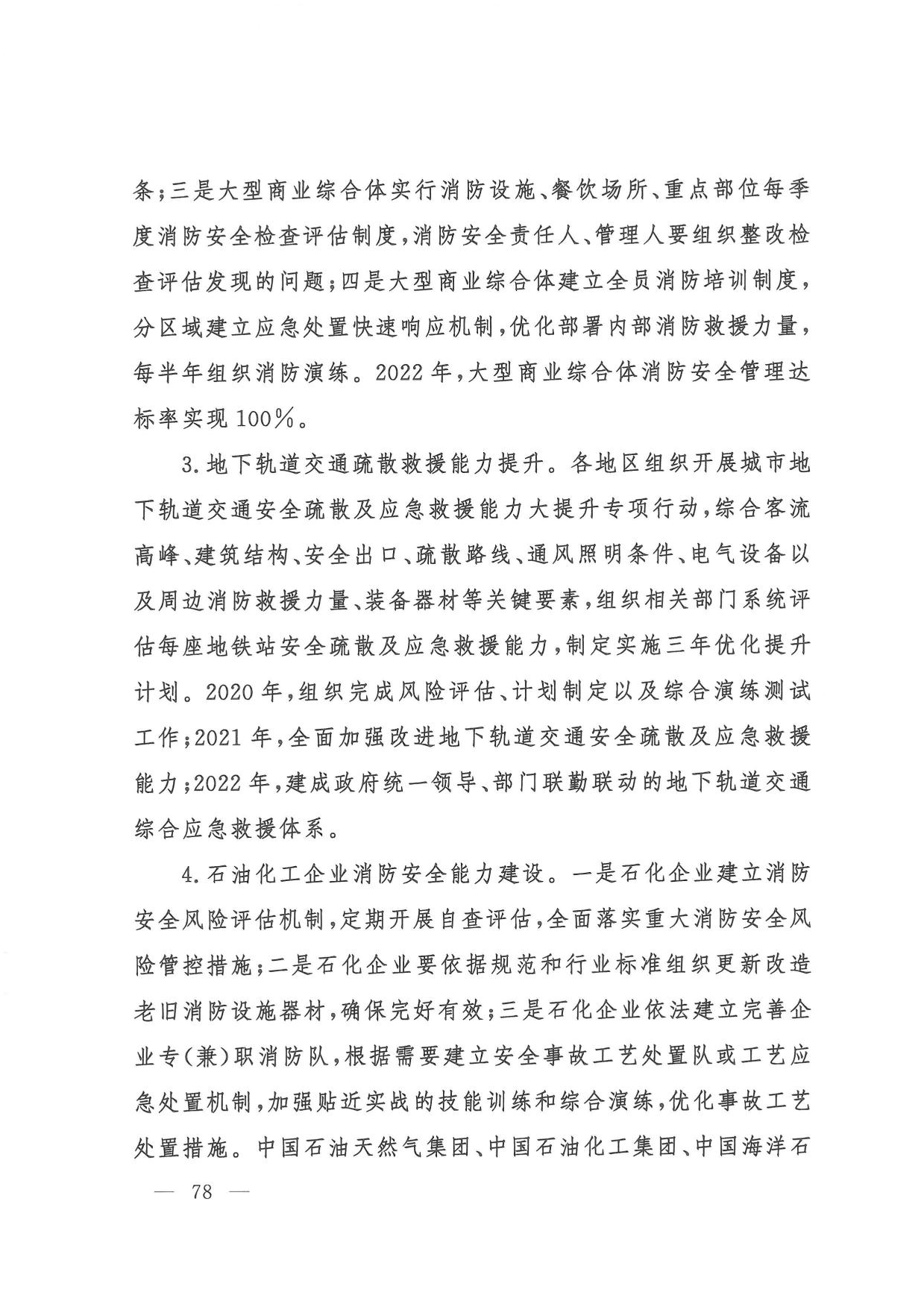 (六)消防安全整治。一是组织开展打通消防“生命通道”工程,指导各地制定实施“一城一策、一区一策”综合治理方案,2022年底前分类分批完成督办整改。二是针对高层建筑、大型商业综合体、地下轨道交通、石油化工等重点场所,制定实施消防安全能力提升方案,2022年底前实现标准化、规范化管理。三是聚焦老旧小区、电动车、外墙保温材料、彩钢板建筑、家庭加工作坊、“三合一”场所、城乡接合部、物流仓储等突出风险以及乡村火灾,分阶段集中开展排查整治,2022年底前全面落实差异化风险管控措施。四是教育、民政、文化和旅游、卫生健康、宗教、文物等重点行业部门建立完善行业消防安全管理规定,明确3年整治目标任务,推动本系统单位提升消防安全管理水平。五是积极推广应用消防安全物联网监测、消防大数据分析研判等信息技术,推动建设基层消防网格信息化管理平台,2021年底前地级以上城市建成消防物联网监控系统,2022年底前分级建成城市消防大数据库。(应急管理部牵头,教育部、公安部、民政部、自然资源部、住房城乡建设部、农业农村部、商务部、文化和旅游部、国家卫生健康委、市场监管总局、国家宗教事务局、国家文物局等按职责分工负责)