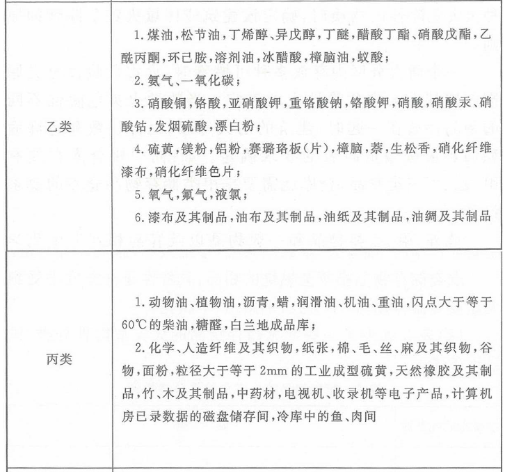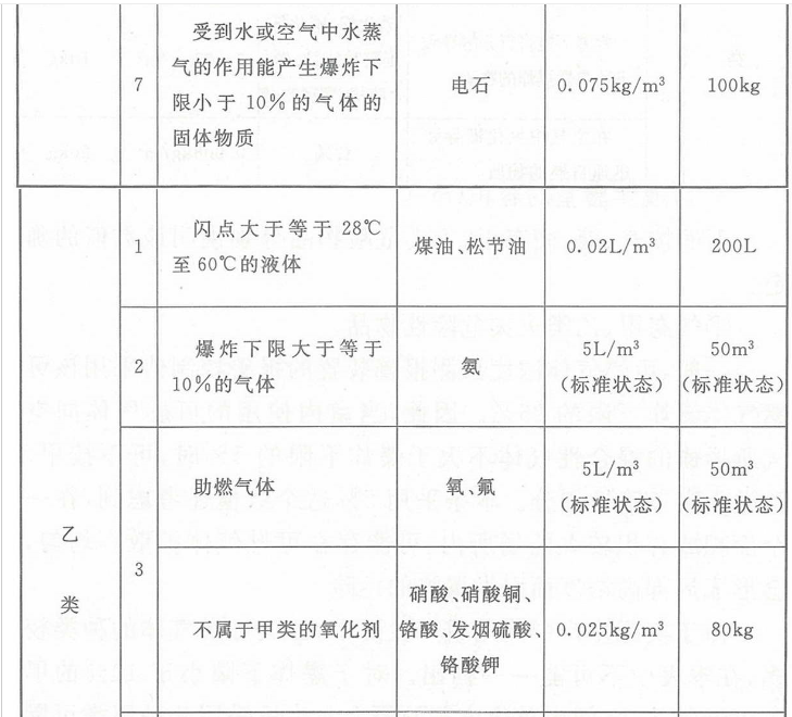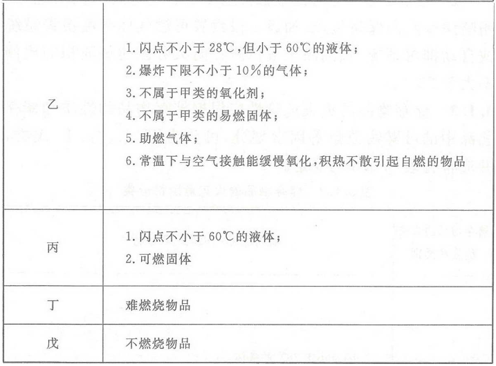 2 )乙类储存物品的划分,主要依据我国《危险货物运输规则》中确定的Ⅱ级易燃固体、Ⅱ级易燃烧物质、Ⅱ级氧化剂、助燃气体、Ⅱ级自燃物品的特性。