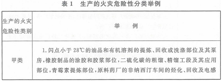 生产的火灾危险性分类受众多因素的影响,设计还需要根据生产工艺、生产过程中使用的原材料以及产品及其副产品的火灾危险性以及生产时的实际环境条件等情况确定。为便于使用,表1列举了部分常见生产的火灾危险性分类。