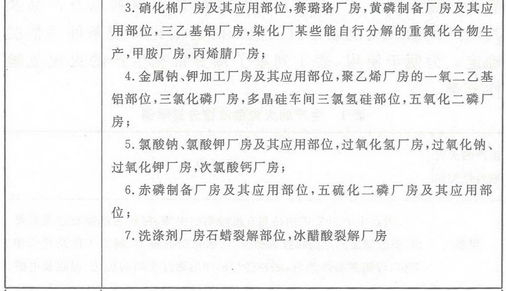 “甲类”第4项:生产中的物质遇水或空气中的水蒸气会发生剧烈的反应,产生氢气或其它可燃气体,同时产生热量引起燃烧或爆炸。该类物质遇酸或氧化剂也能发生剧烈反应,发生燃烧爆炸的火灾危险性比遇水或水蒸气时更大,如金属钾、钠、氧化钠、氢化钙、碳化钙、磷化钙等的生产。