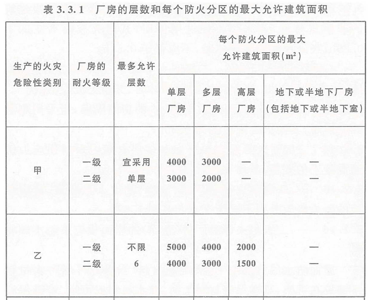 3.3.1 除本规范另有规定外,厂房的层数和每个防火分区的最大允许建筑面积应符合表3.3.1的规定。