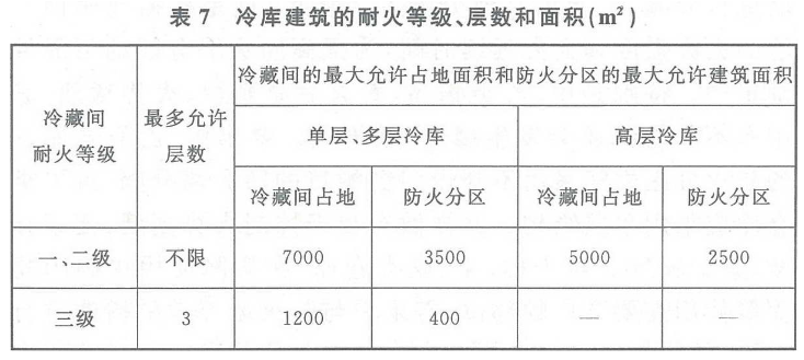 7 一、二级耐火等级冷库的最大允许占地面积和防火分区的最大允许建筑面积,应符合现行国家标准《冷库设计规范》GB 50072的规定。