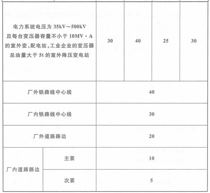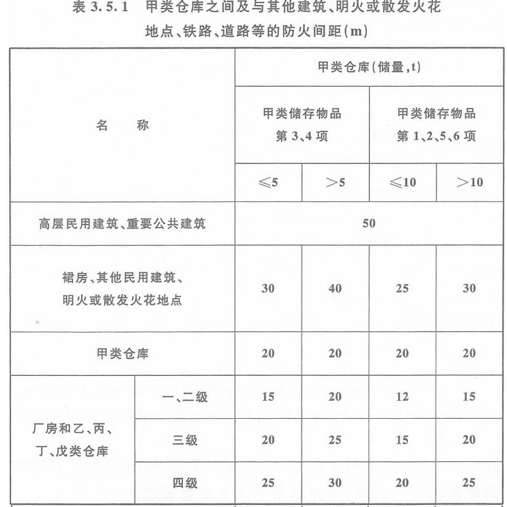 3.5.1 甲类仓库之间及与其他建筑、明火或散发火花地点、铁路、道路等的防火间距不应小于表3.5.1的规定。