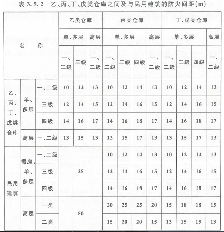 3.5.2 除本规范另有规定外,乙、丙、丁、戊类仓库之间及与民用建筑的防火间距,不应小于表3.5.2的规定。