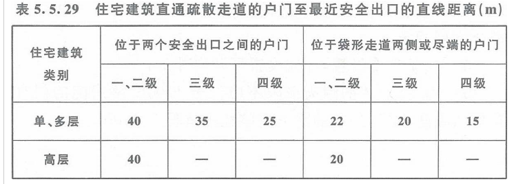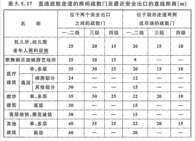 注:1 建筑内开向敞开式外廊的房间疏散门至最近安全出口的直线距离可按本表的规定增加 5m。