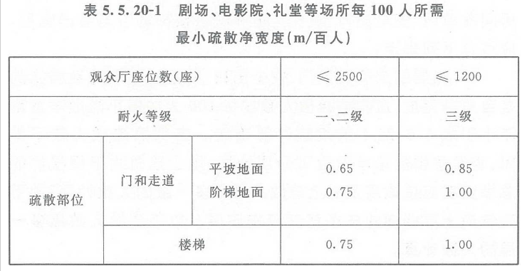 2 剧场、电影院、礼堂等场所供观众疏散的所有内门、外门、楼梯和走道的各自总净宽度,应根据疏散人数按每100人的最小疏散净宽度不小于表5.5.20-1的规定计算确定;