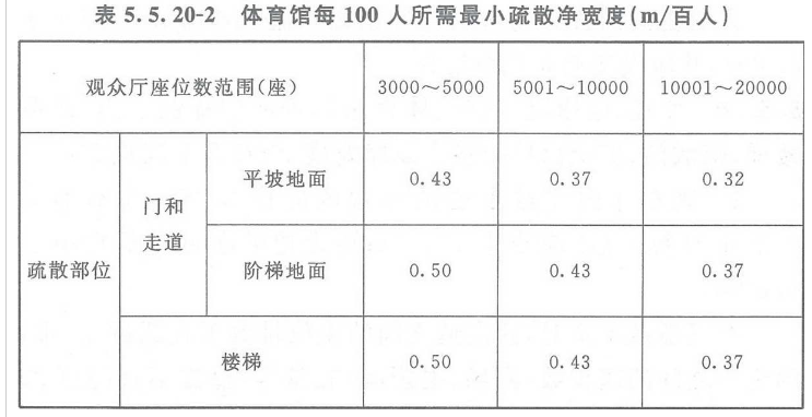 注:本表中对应较大座位数范围按规定计算的疏散总净宽度,不应小于对应相邻较小座位数范围按其最多座位数计算的疏散总净宽度。对于观众厅座位数少于3000个的体育馆,计算供观众疏散的所有内门、外门、楼梯和走道的各自总净宽度时,每100人的最小疏散净宽度不应小于表5.5.20-1的规定。