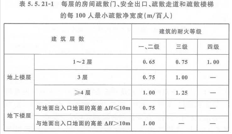 5.5.21 除剧场、电影院、礼堂、体育馆外的其他公共建筑,其房间疏散门、安全出口、疏散走道和疏散楼梯的各自总净宽度,应符合下列规定: