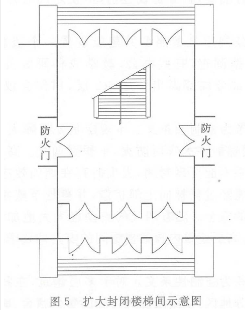 对应设置封闭楼梯间的建筑,其底层楼梯间可以适当扩大封闭范围。所谓扩大封闭楼梯间,就是将楼梯间的封闭范围扩大,如图 5 所示。因为一般公共建筑首层入口处的楼梯往往比较宽大开敞,而且和门厅的空间合为一体,使得楼梯间的封闭范围变大。对于不需采用封闭楼梯间的公共建筑,其首层门厅内的主楼梯如不计入疏散设计需要总宽度之内,可不设置楼梯间。