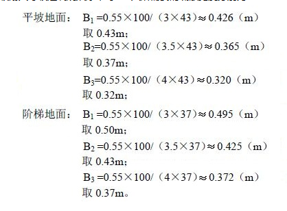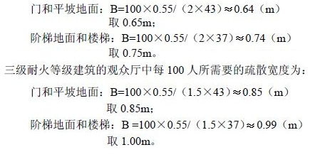 据此,按照疏散净宽度指标公式计算出一、二级耐火等级建筑的观众厅中每100 人所需疏散宽度为: