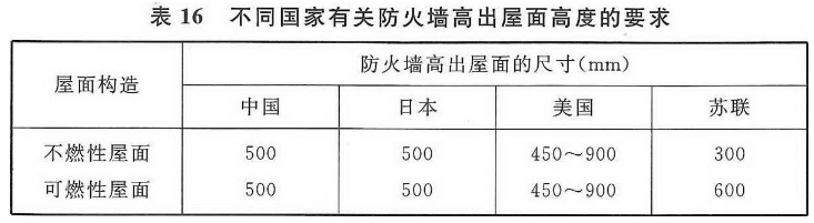 本条中的数值是根据我国有关火灾的实际调查和参考国外有关标准确定的。不同国家有关防火墙高出屋面高度的要求,见表16。设计应结合工程具体情况,尽可能采用比本规范规定较大的数值。