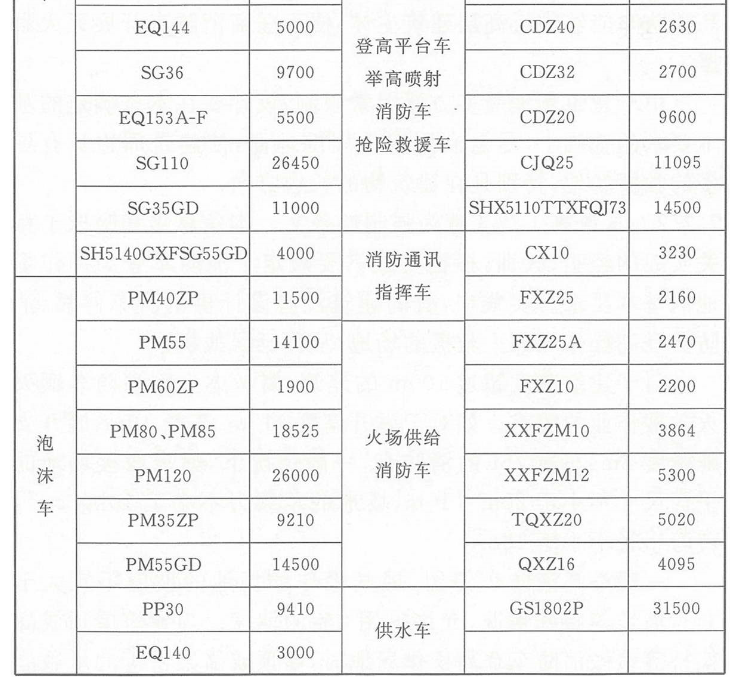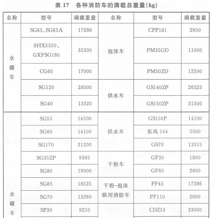 在设置消防车道和灭火救援操作场地时,如果考虑不周,也会发生路面或场地的设计承受荷载过小,道路下面管道埋深过浅,沟渠选用轻型盖板等情况,从而不能承受重型消防车的通行荷载。特别是,有些情况需要利用裙房屋顶或高架桥等作为灭火救援场地或消防车通行时,更要认真核算相应的设计承载力。表17为各种消防车的满载(不包括消防员)总重,可供设计消防车道时参考。