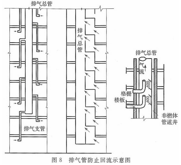 住宅建筑中的排风管道内采取的防止回流方法,可参见图8所示的做法。具体做法有: