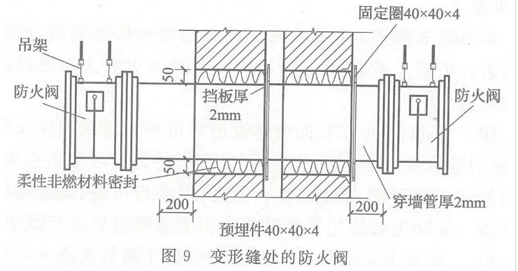 4 在穿越变形缝的两侧风管上。在该部位两侧风管上各设一个防火阀,主要为使防火阀在一定时间里达到耐火完整性和耐火稳定性要求,有效地起到隔烟阻火作用,参见图9。