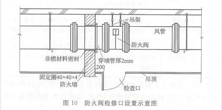 (2) 为使防火阀能及时关闭,控制防火阀关闭的易熔片或其它感温元件应设在容易感温的部位。设置防火阀的通风管要求具备一定强度,设置防火阀处要设置单独的支吊架,以防止管段变形。在暗装时,需在安装部位设置方便检修的检修口,参见图10。