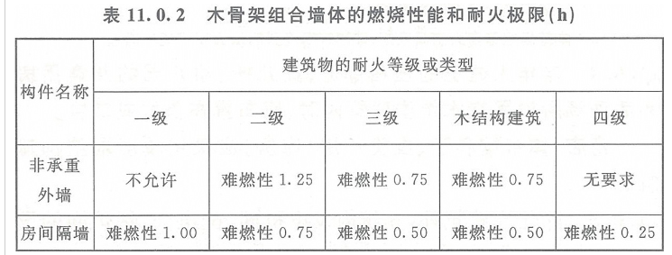 3 木骨架组合墙体的燃烧性能和耐火极限应符合表11.0.2的规定,其他要求应符合现行国家标准《木骨架组合墙体技术规范》GB/T 50361的规定。
