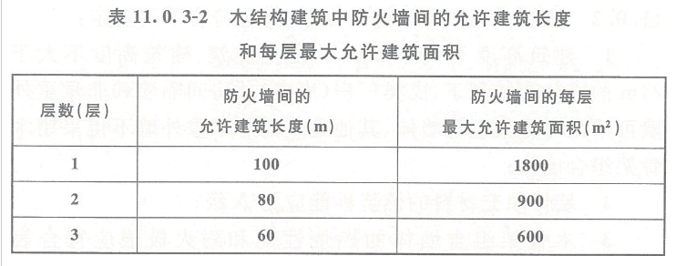 11.0.3 甲、乙、丙类厂房(库房)不应采用木结构建筑或木结构组合建筑。丁、戊类厂房(库房)和民用建筑,当采用木结构建筑或木结构组合建筑时,其允许层数和允许建筑高度应符合表11.0.3-1的规定,木结构建筑中防火墙间的允许建筑长度和每层最大允许建筑面积应符合表11.0.3-2的规定。