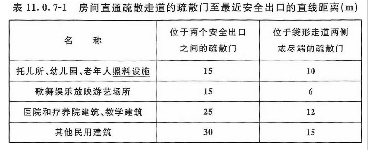 3 房间内任一点至该房间直通疏散走道的疏散门的直线距离,不应大于表11.0.7-1中有关袋形走道两侧或尽端的疏散门至最近安全出口的直线距离;