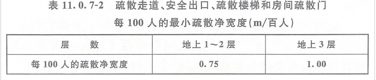 4 建筑内疏散走道、安全出口、疏散楼梯和房间疏散门的净宽度,应根据疏散人数按每100人的最小疏散净宽度不小于表11.0.7-2的规定计算确定;