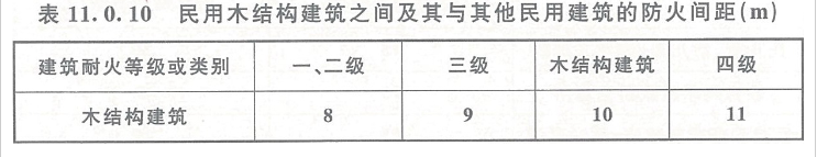 11.0.10 本条为强制性条文。木结构建筑之间及木结构建筑与其他结构类型建筑的防火间距,是在分析了国内外相关建筑规范基础上,根据木结构和其他结构类型建筑的耐火性能确定的。