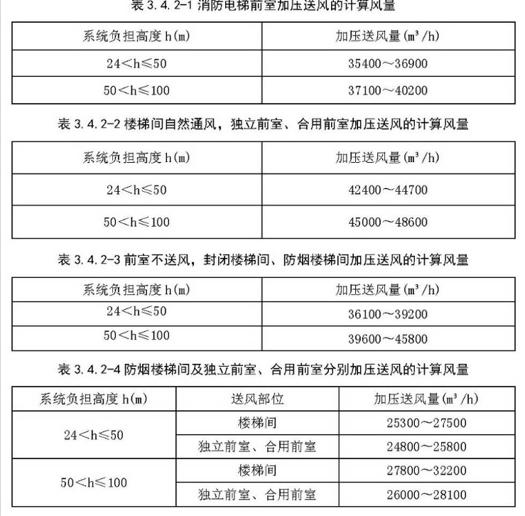 3.4.1 机械加压送风系统的设计风量不应小于计算风量的1.2倍。3.4.2 防烟楼梯间、独立前室、共用前室、合用前室和消防电梯前室的机械加压送风的计算风量应由本标准第3.4.5条〜第3.4.8条的规定计算确定。当系统负担建筑高度大于24m时,防烟楼梯间、独立前室、合用前室和消防电梯前室应按计算值与表3.4.2-1〜表3.4.2-4的值中的较大值确定。
