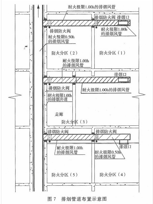 当排烟管道水平穿越两个及两个以上防火分区时,或者布置在走道的吊顶内时,为了防止火焰烧坏排烟风管而蔓延到其他防火分区,本标准要求排烟管道耐火极限不小于1.0h,提高排烟的可靠性。对于管道的耐火极限的判定必须按照《通风管道耐火试验方法》GB/T