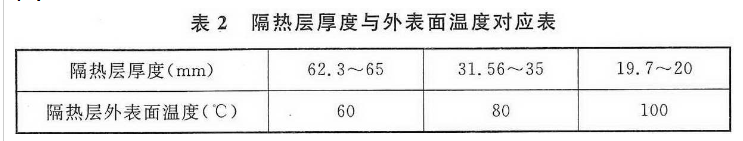 举例:隔热材料选用玻璃棉,计算环境温度35℃,烟气温度280℃,表面放热系数8.141W/(m²·K),计算结果见表2。