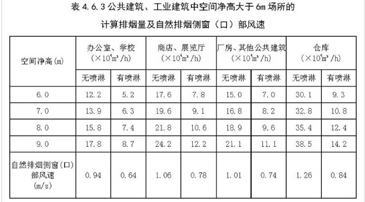 注:1.建筑空间净高大于9.0m的,按9.0m取值;建筑空间净高位于表中两个高度之间的,按线性插值法取值;表中建筑空间净高为6m处的各排烟量值为线性插值法的计算基准值。